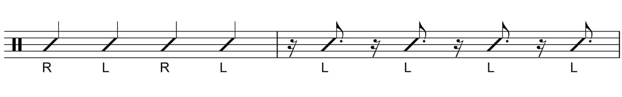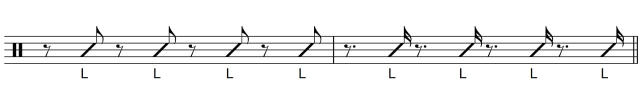 Develop the dotted eighth note. Start with the left keeping time lightly on the rim or on your leg then remove it in the next measure.