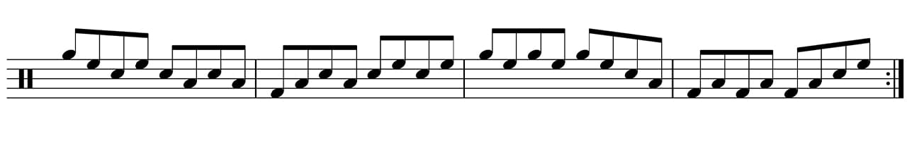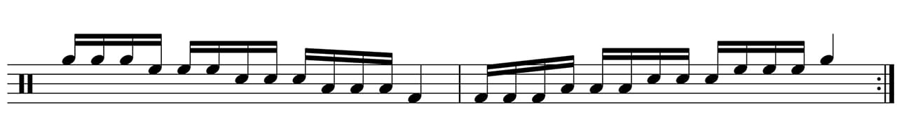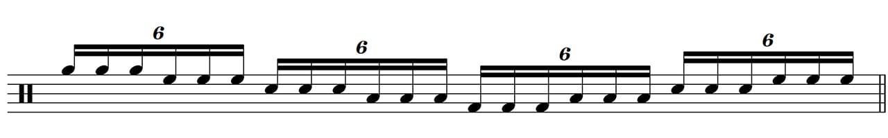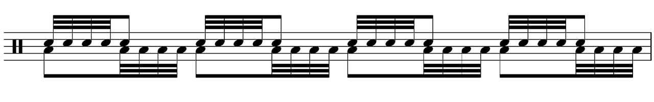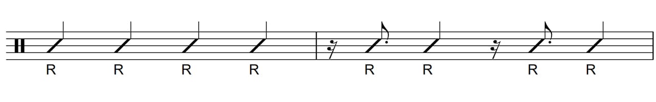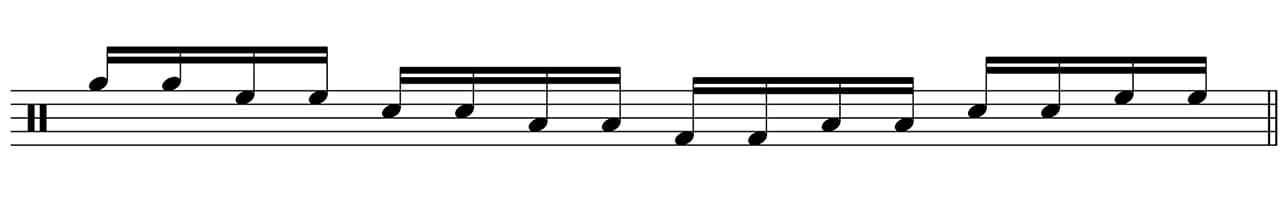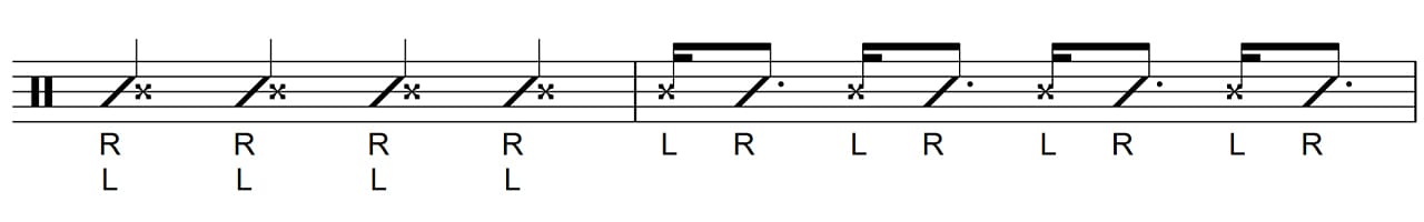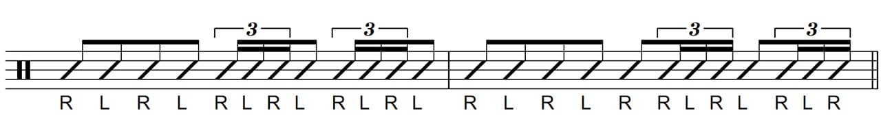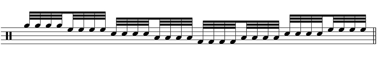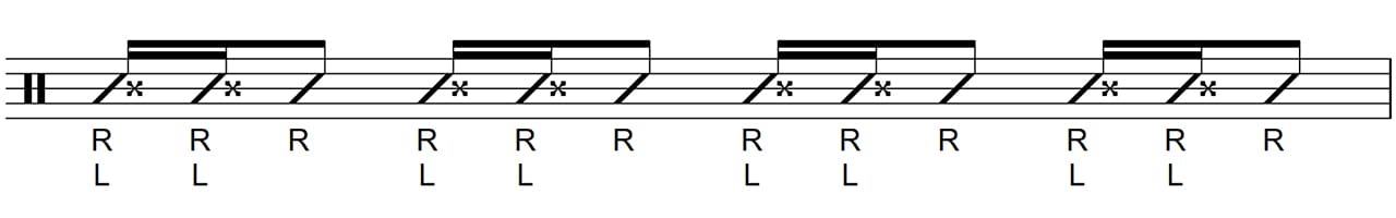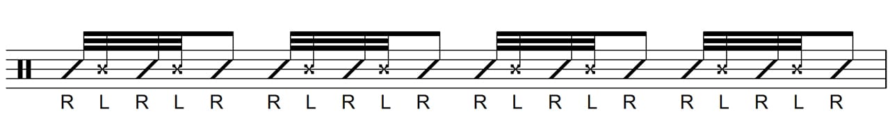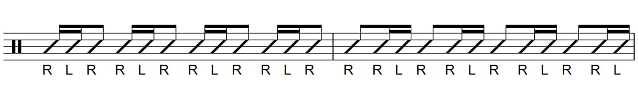 The stickings below are based on right hand lead natural sticking. When playing 16th notes in this sticking pattern, the right hand falls on all downbeats and upbeats while the left cuts that in half on all Es and As.
