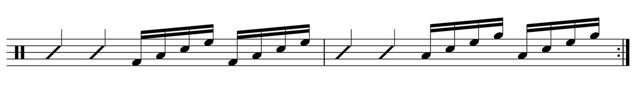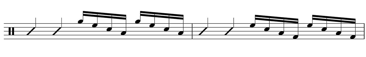 Create 16th note split 2s by adding left hands or diddles to each of the 8th note splits above.