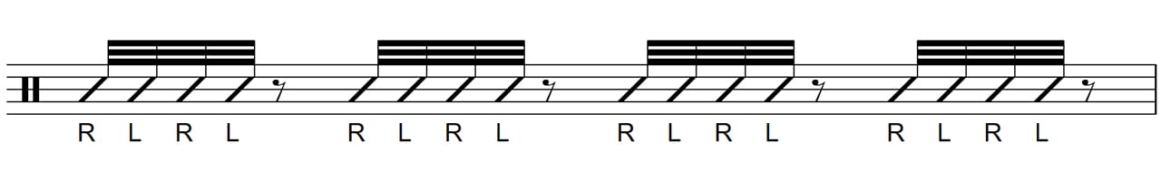Offsetting diddles on each hand will produce single stroke 4s. Use the push pull technique and delay one hand briefly. Both hands come down one after another, similar to producing a flat flam.