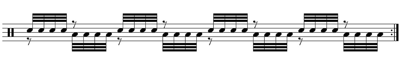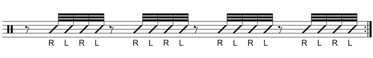 Play one bar of time/check and then insert any of the 16th partials found below. Check or compare your timing, stroke types, sticking, and sound quality of each insert to that of your 16th note check. The goal is to cut each beat in to 4 equal parts. Strive for mathematical accuarcy and spacing. Be sure to check out Legato Strokes to develop an even 16th note check and partials.