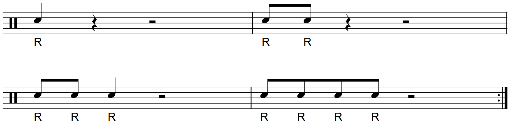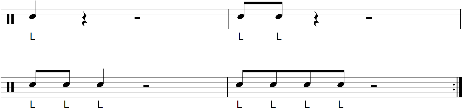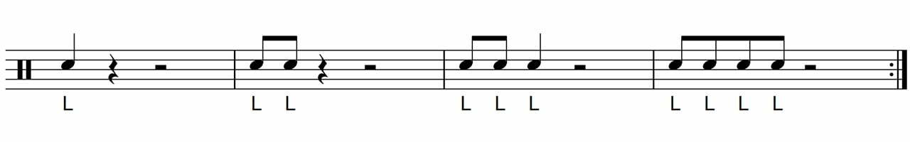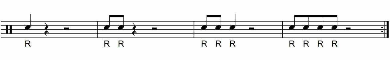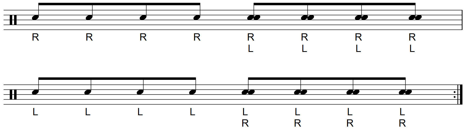 I typically practice the above exercises at 12″, then cut that in half to 6″, then again at 3″. Once my students have a solid 3″ tap, this lends well to now adding accents. Now you can start looking at Down Strokes and Up Strokes.