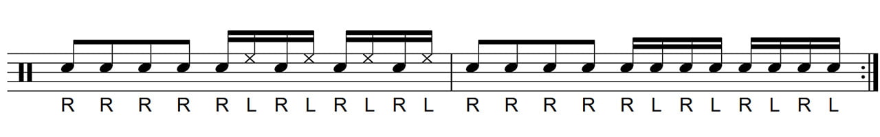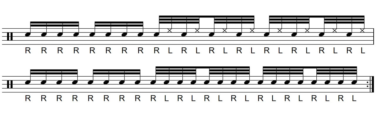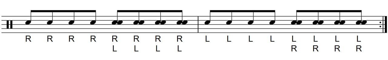 Also be sure to practice at multiple tempos. At slow speeds, a full stroke can be produced with the wrist, similar to striking a bell. As tempos start to increase, however, you will need to use your fulcrum and open up the fingers. I typically try to develop the fingers first, then I’ll add wrist and elbow for more power.